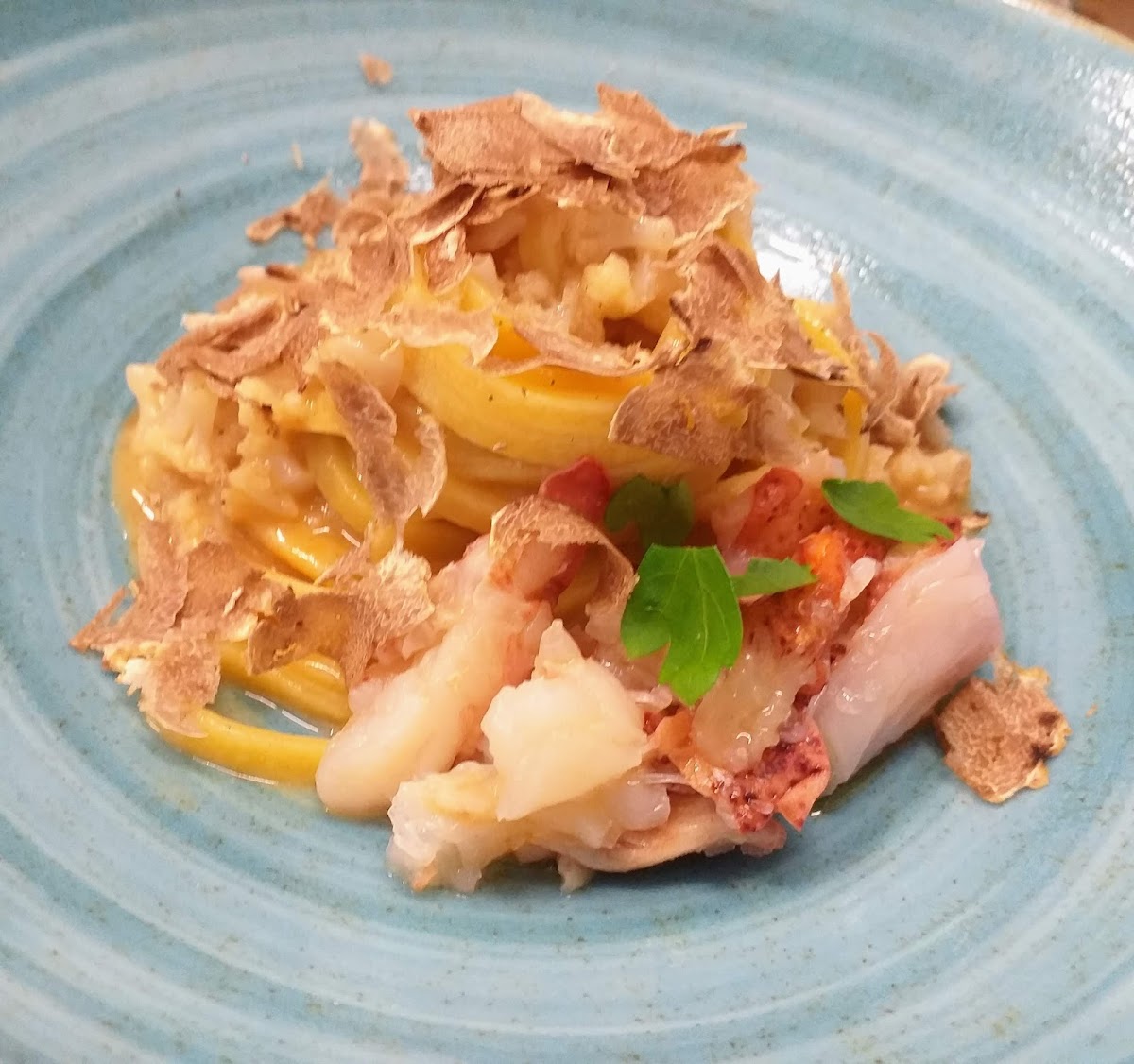In summer you eat outside in a courtyard in a beautiful vicole just off Corso d’Augusto. The service was attentive and friendly but not overbearing. The Indomabile all’Astice was wonderful and so was the zesty, aromatic insalata. Plus the chef brought two little appetizers, one of them gazpacho with melon. Fantastic. A lovely experience.